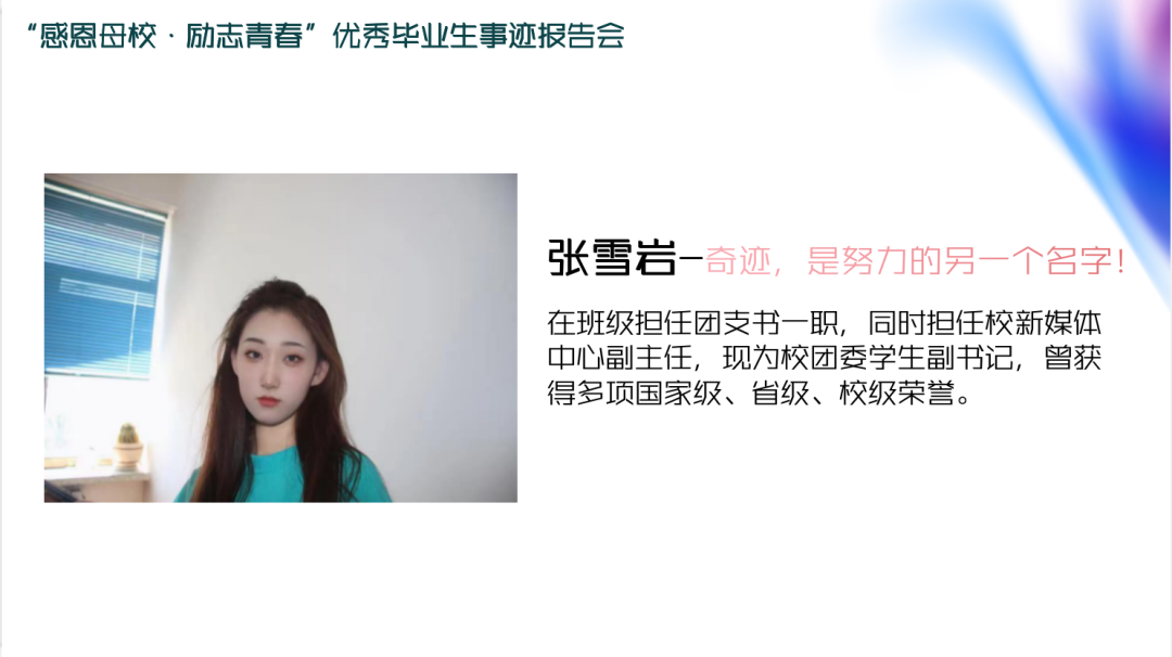 张雪岩和大家分享了自己的在校经历,在校期间她积极向党组织靠拢,成为了一名光荣的共产党员。担任班级团支书、校新媒体中心副主任期间多次组织和参与学校各项比赛、文娱活动,获得了多项荣誉,提升了自己的综合素质,积累了宝贵的实战经验。既然选择了远方,便只顾风雨兼程!作为学生要牢记“学习永远是主题”,青春因奋斗而精彩。作为“龙职人”,我们应该饮水思源、感恩母校、铭记师恩,用努力奋斗填好人生履历表,交出优秀答卷,为母校增光添彩。
