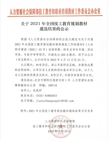 2022年3月17日,人力资源与社会保障部公示了2021年全国技工教育规划教材遴选结果,农牧工程学院11部教材成功入选。