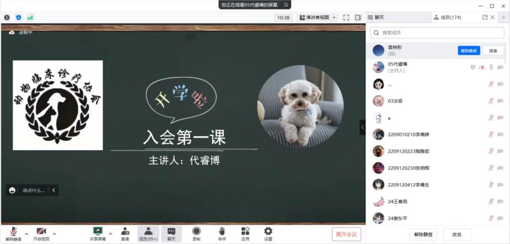 在活动过程中,第五届协会会长动物医学21-05班代睿博介绍了协会发展历程、具体职能、骨干成员分工及本学期活动计划,展示了协会中趣味横生的项目与专业性强的各种技能赛事,强调了对新会员的要求与活动规则,分享了协会旗下小动物们的趣事,引起会员们极大的学习兴趣。