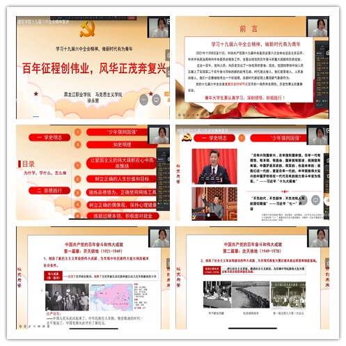 宣讲会上,徐永慧老师从党的十九届六中全会的会议精神、重要性和启示性等方面做了全面深入的解读,带领学生重温红色经典,回顾党的重大历史事件,引导学生做新时代有为青年。宣讲会分为两部分内容和四个篇章进行开展,两部分内容分别是一:学史明志、二:崇德践行;四个篇章分别是第一篇章:开天辟地、第二篇章:改天换地、第三篇:翻天覆地和第四篇章:惊天动地。徐老师多维度的穿插解读“没有中国共产党行不行”?“中国不走社会主义道路行不行”?“党做的一切有何启示”?等知识点来阐述十九届六中全会的重要性和启示性。并向同学们认真宣讲新时代的青年为什么要爱国、如何爱国、爱国应该怎么做,以及如何树立正确的价值观等现实问题,徐老师将历史事件和当代青年的榜样案例结合在一起,深入浅出地讲给大家听。同学们纷纷表示,通过本次宣讲会的学习,更加明确了新时代青年的历史使命和责任感,会不断加强自身学习,时刻关注社会需求,跟上时代发展。同时对徐老师认真严谨的宣讲表达了衷心的感谢!