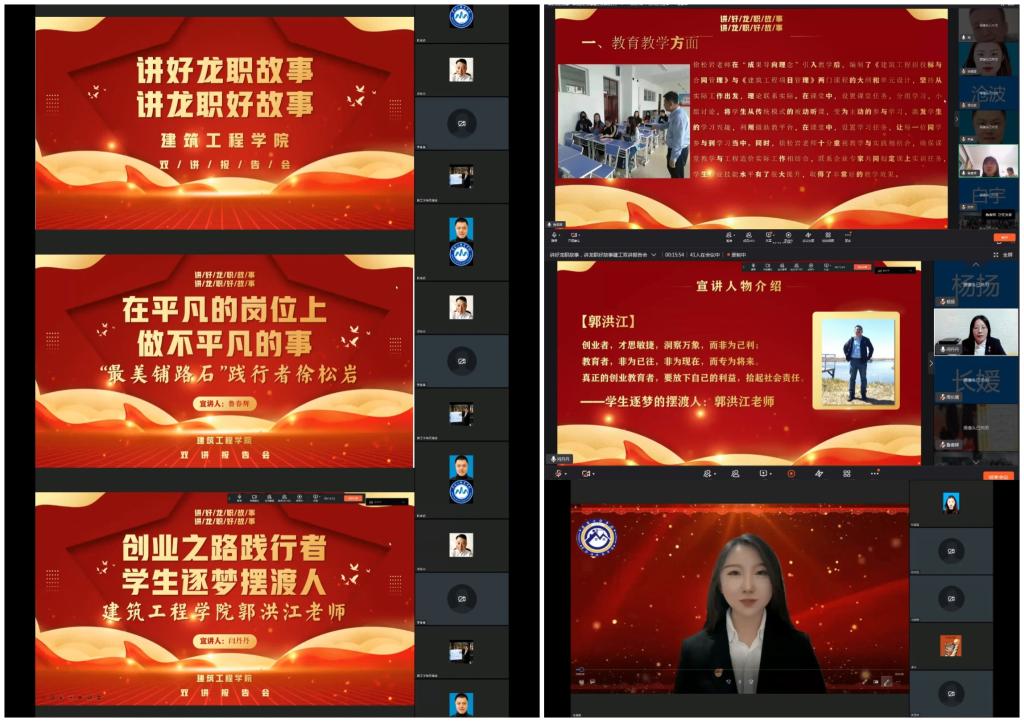 十年风雨育桃李,造就英才铸春秋。在龙职成立十周年之际,日前,建筑工程学院党总支通过钉钉APP举行“讲好‘龙职’故事·讲‘龙职’好故事”双讲报告会。学院领导班子成员出席会议,全体教职工参加会议。会议由学院党总支副书记孙若鹏主持。