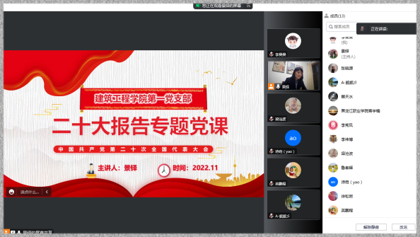 党的二十大是在全党全国各族人民迈上全面建设社会主义现代化国家新征程,向第二个百年奋斗目标进军的关键时刻召开的一次十分重要的大会。为深入学习贯彻党的二十大精神,切实把党员干部的思想和行动统一到大会精神上来,2022年11月29日晚18时,建筑工程学院教师第一党支部通过线上会议的形式,开展了学习党的二十大精神专题党课,本次党课由教师第一党支部书记景铎讲授,党支部全体党员参加了学习。