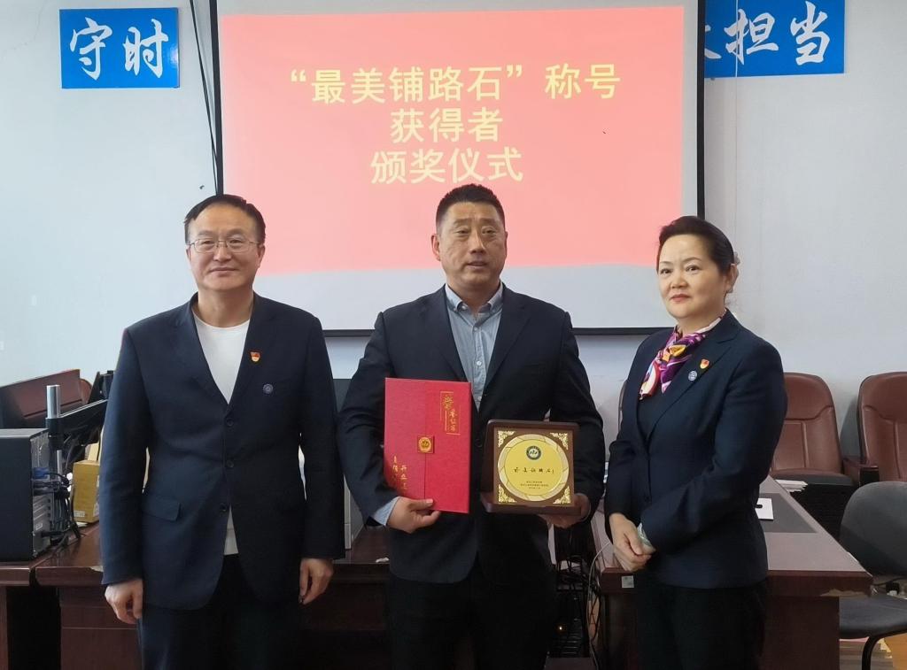 随后,由党总支书记范海波、院长张皓分别为两位获奖教师颁发证书和奖杯并合影留念,这是学院对获得“最美铺路石”称号教师在工作中的表现给予的高度肯定,并鼓励他们持续努力,激励全院师生向他们学习,向他们致敬!