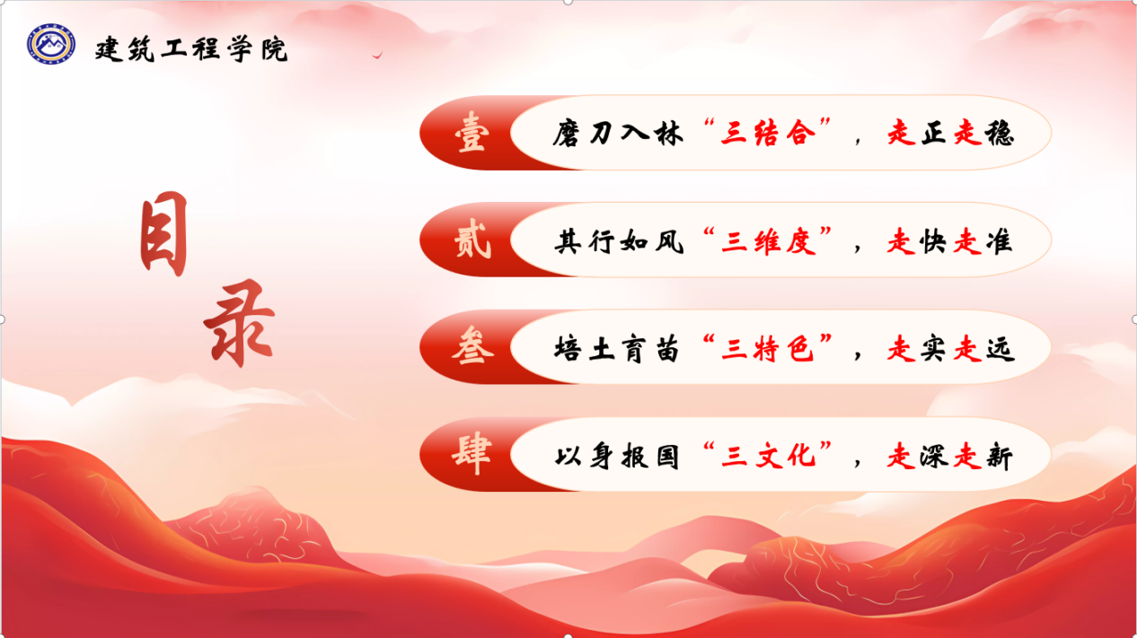 本次活动汇报分为四个部分,磨刀入林“三结合”,走正走稳;其行如风“三维度”,走快走准;培土育苗“三特色”,走实走远;以身报国“三文化”,走深走新。建筑工程学院纪念先烈主题活动中,紧密围绕“广度、精度、速度”三个维度,通过周密策划与高效执行,成功开展了系列纪念活动,活动覆盖学生群体超过3500人次,开展12项形式多样的纪念活动,充分体现了对先烈的崇敬之情和对历史的传承责任。