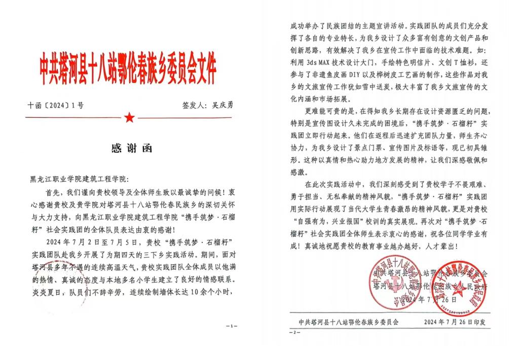 近日,永利集团88304官网建筑工程学院收到来自塔河县十八站鄂伦春民族乡党委和乡政府一封感谢信,信中鄂伦春民族乡对建筑工程学院“携手筑梦·石榴籽”社会实践团在当地的服务奉献和技术支持表示衷心感谢。