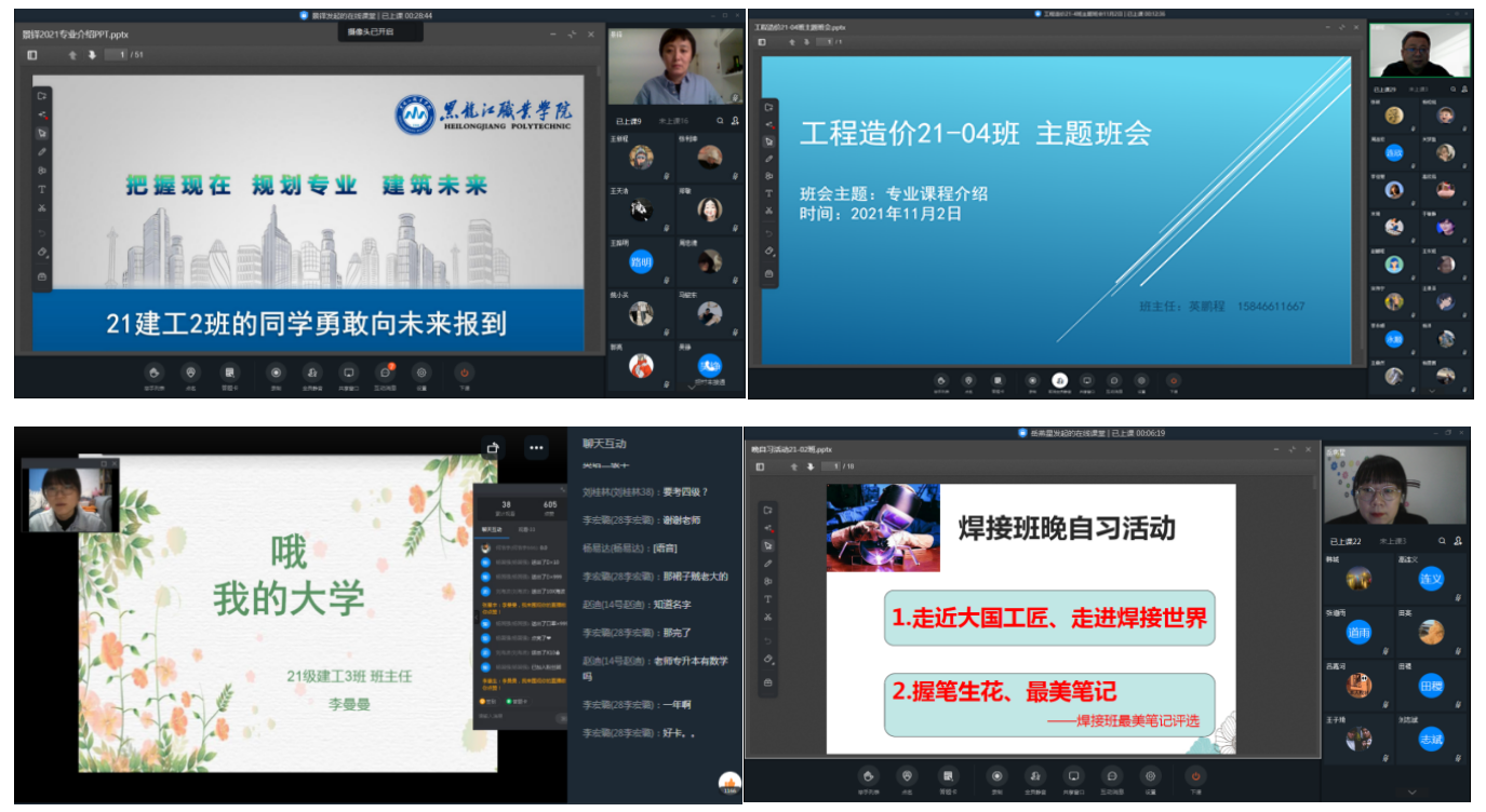 各位班主任老师针对目前学生的特点,结合专业特色,大量收集素材,经过认真筹备和设计,通过钉钉在线的方式,给同学们上了一堂别开生面的“特色晚自习”。特色晚自习有的是主题班会,有的是热点话题讨论。丰富了大学生晚自习生活,以新颖的方式吸引同学们的注意力,提高了同学们的学习兴趣和专业认知,学习效率得到了大幅提升,同时班集体的凝聚力也有所增强。