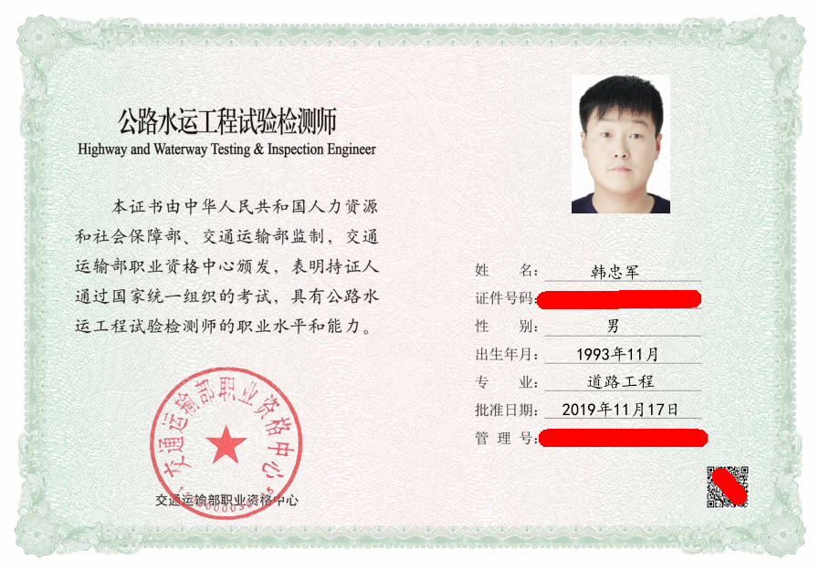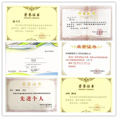 工作以来,认真严谨就成了他的代名词,他一直以成为一名优秀的中国建筑试验者而努力。认真提高工作技能,掌握专业知识,考取相关证书,积极参加公司组织的软件学习,下面罗列一些主要的证书及荣誉:在2017年“提高水泥搅拌桩成桩合格率”质量管理小组中荣获河南省工程建设优秀质量管理小组三等奖;在公司2018年“试验检测技能比武大赛”获得团体三等奖;2018年凭借“拓荒先锋QC小组”荣获河南省市政公用工程建设质量管理小组优秀奖;2018年凭借“天山来客QC小组(提高空心板梁预制表观质量一次合格率)”荣获河南省工程建设优秀质量管理小组二等奖;在2018年取得了BIM Revit 初级证书;在公司2019年“试验检测技能比武大赛”个人成绩第二名,被授“技术能手”荣誉称号。
