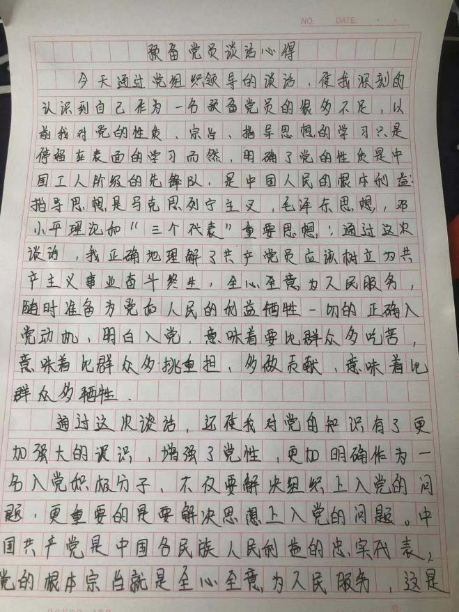 会议第三项为毕业生党员重温入党谈话。入党谈话作为发展党员的一项重要工作,其效果如何直接关系到党组织的战斗堡垒作用的发挥,直接关系到党的先进性的保持。通过入党谈话我们能了解到申请人的入党动机是否端正,对党的基本知识是否了解,入党手续是否符合规定等内容,同时,通过谈话也能够让入党申请人比较清楚的知道自己在哪些方面符合或基本符合条件,哪些方面做得还不够,今后努力的方向是怎样的。毕业生党员通过重温入党谈话写下了自己的心得体会,他们也从谈话人身上看到了一名优秀的党员是怎样在工作和生活中约束自己的行为的,并承诺在以后的工作与学习中,时时刻刻将自己与党联系在一起,凡事都秉着认真的态度去对待,以更高的标准要求自己。