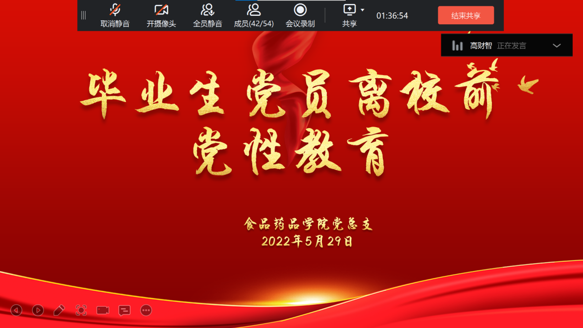 为加强毕业生党员党性教育,引导毕业生党员在新的人生起点继续发挥先锋模范作用。5月29日晚,食品药品学院党总支通过网络会议形式开展毕业生党员离校前教育活动。食品药品学院党总支书记陈晓华、党总支副书记高财智、学生党支部书记宓宪伟、组织员芦清以及所有毕业生党员参加了此次会议。