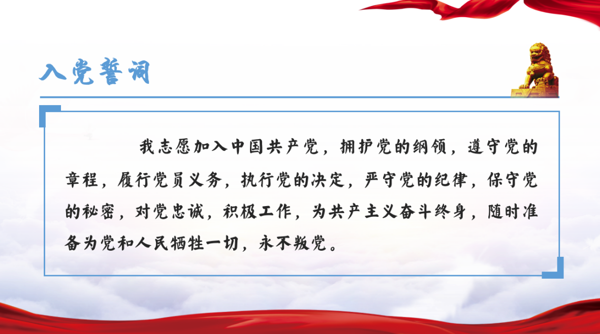 会议开始由学生党支部书记宓宪伟带领全体参会党员重温入党誓词。入党誓词是行动指南,是共产党人的座右铭,不断重温,终身践行,前进路上,对照承诺,时时检视自我,不