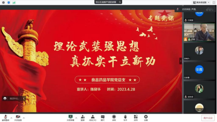4月28日下午,食品药品学院党总支书记陈晓华在2号实训楼525以《理论武装强思想真抓实干立新功》为主题为党总支全体党员讲授学习贯彻习近平新时代中国特色社会主义思想主题教育专题党课。学院领导班子成员、全体教师党员、学生党员共同聆听。