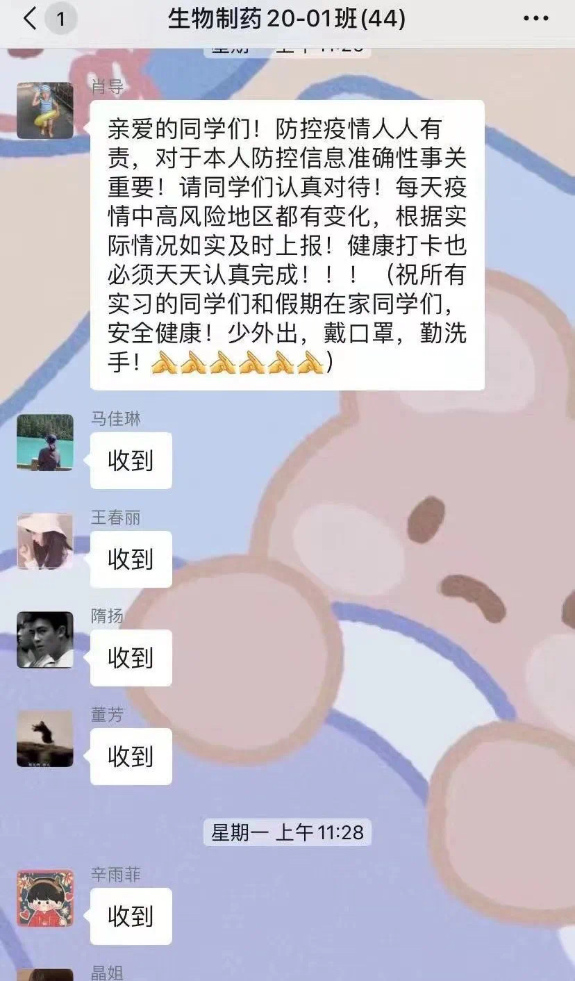 辅导员在班群中随时告知学生全国疫情中高风险地区变化情况,避免出行及接触,提醒处于中高风险地区的要配合当地政府防疫举措并及时向学校报备。同时,及时了解处于中高风险地区学生的心理状况,给予必要的精神支持和心理疏导。告知学生不信谣,不传谣,以辅导员的通知为准,多关注班群消息,主动配合学校管理安排,严格遵守健康情况日报告制度,如遇特殊情况及时上报。