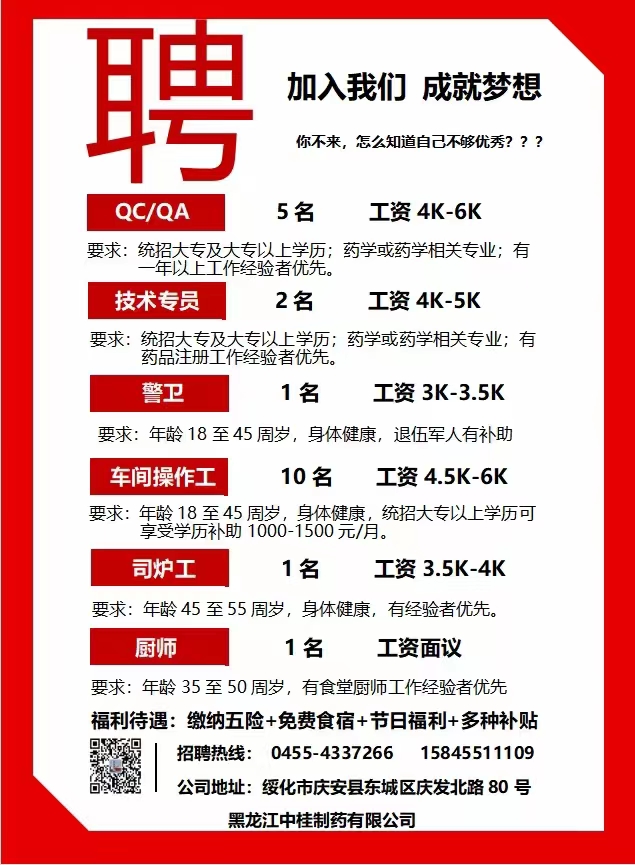 黑龙江中桂制药有限公司招聘