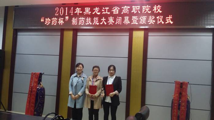 2014年9月24日,由黑龙江省教育厅主办,黑龙江省实践教学指导委员会、黑龙江省高职高专教育制药类专业教学指导委员会、黑龙江珍宝岛药业股份有限公司和黑龙江农业经济职业学院承办,2014年黑龙江省职业院校“珍药杯”制药技能大赛在黑龙江农业经济职业学院隆重举行。全省共有八支代表队参加比赛。本次大赛为团体赛,经过一天的激烈角逐,我院药营12-301班的王丹同学、药检12-301班马晓齐同学生产的片剂得到评委的一致认可,荣获团体二等奖。指导教师欧阳慧英和崔晓彪老师荣获优秀指导教师奖。