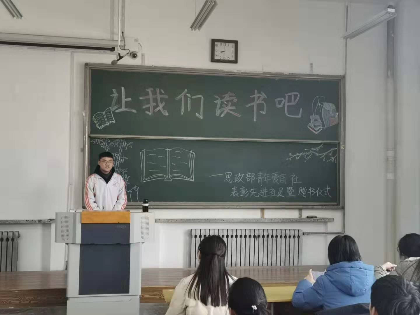 在思政部德育教研室的教师指导下,本学期青年爱国社先后成功举办了重阳节送温暖、爱国知识小竞赛等活动,为表彰先进社员、鼓励社员们再接再厉、给予社员们更有益的提升思想和见识的途径,思政部购买了适合的并受同学们喜爱的图书,赠予在本学期活动中表现突出的先进社员。同学们分享了自己读书的心得与体会,张旭老师勉励同学们要多读书、读好书,在阅读中提升自己的视野、丰富自己的见识!