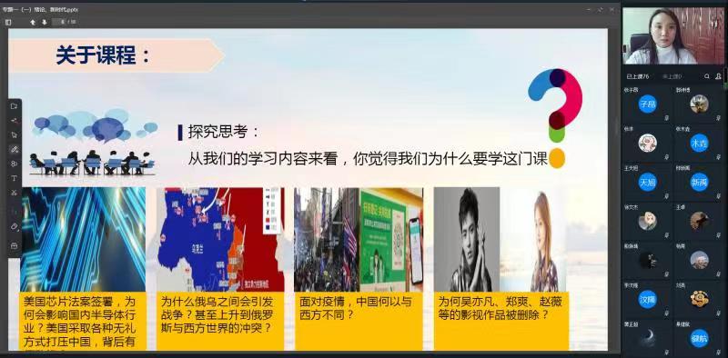 经过认真准备,周敏和王丽老师在云端网络与新生们见面了。两位老师以问题导向和互动研讨开启了2022级新生第一节思政课,学生们精神饱满、答题踊跃,展现出了大学生应有的精神风貌。两位老师为本学期课程打下一个良好的开端。
