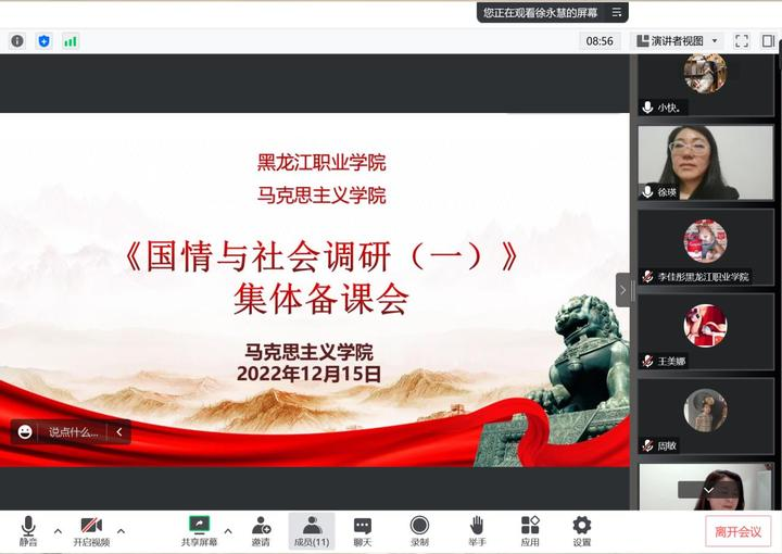 2022年12月15日马克思主义学院德育教研室组织了《国情与社会调研》第一次集体备课与教学研讨线上会议。会议由德育教研室徐永慧主任主持,徐瑛副院长和全体德法课教师参加。