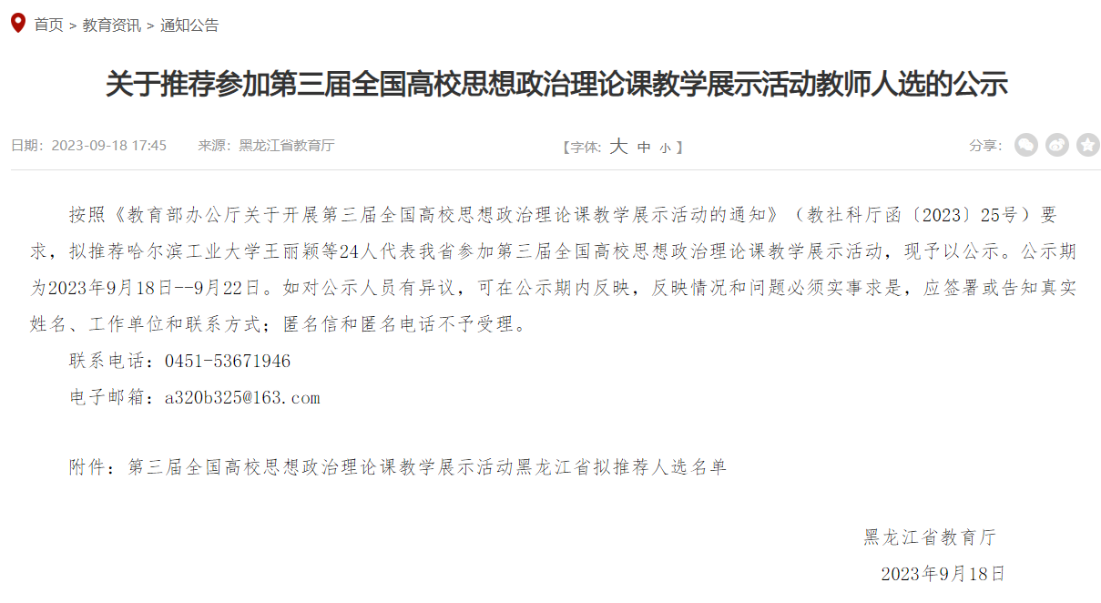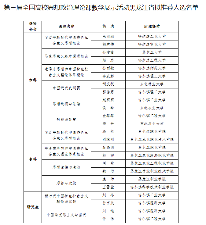 近日,按照《教育部办公厅关于开展第三届全国高校思想政治理论课教学展示活动的通知》(教社科厅函〔2023〕25号)要求,黑龙江省教育厅经过遴选,拟推荐24名高校思政课教师代表我省参加第三届全国高校思想政治理论课教学展示活动,永利官网马克思主义学院青年教师杨凯、秦晶娟、康帅经过激烈的角逐,在众多选手中脱颖而出,位列前茅,将与全国思政课教师选手一起竞技擂台,展示黑龙江省思政课教师的风采。