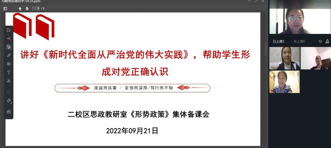 2022-2023年度第一学期新学期伊始,马克思主义学院第二校区思政教研室于2022年9月21日进行了线上《形势政策》课第一专题集体备课,同课异构、协同共研,创新教法、提升效果。此次会议由教研室主任张丽艳主持,教研室全体教师参加。