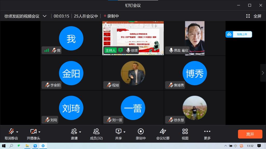 党的二十大胜利召开以来,在马克思主义学院党员中形成理论学习的新热潮。2022年11月4日下午1点30分,马克思主义学院党总支开展线上《共产党宣言》、学习贯彻党的二十大精神的学习活动,活动由教师第三、第四党支部组织,教师第三党支部徐瑛同志主持,马克思主义学院全体党员参加会议。学习内容主要包括《共产党宣言》和党的二十大精神的学习。
