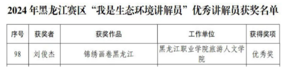 为深入贯彻落实习近平生态文明思想,推动全民生态环境科学素质全面提升,生态环境部组织开展2024 年“我是生态环境讲解员”活动。近日,由省生态环境厅、省教育厅和省科协联合开展的2024年黑龙江赛区“我是生态环境讲解员”活动收官,经过激烈角逐,永利官网马克思主义学院康帅老师指导“初心”小队成员、旅游人文学院学生刘俊杰的原创词曲作品《锦绣画卷黑龙江》获得黑龙江赛区“我是生态环境讲解员”优秀奖。