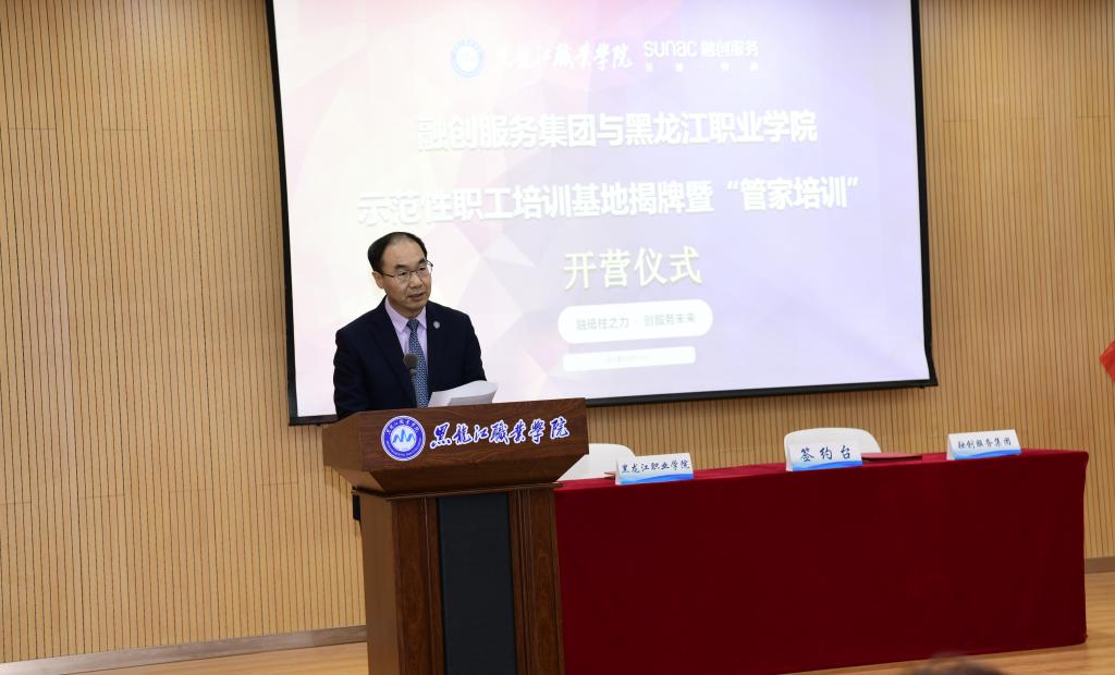 接下来,副校长王明海发表致辞。他首先介绍了当前党中央、国务院对于职业教育的重视程度,习近平总书记对职业教育提出了新的要求,肯定了职业教育的重要地位,指出了职业教育新的办学格局和方向。国务院出台了系列政策文件,倡议职业教育携手行业龙头企业,为国家发展培养高素质技术技能人才。接着,他介绍了学校的办学历史、办学理念和优势以及工商管理学院为服务龙江经济培养优秀人才的突出表现。他表示,学校将大力支持与融创服务集团的产教融合项目,希望双方在现有基础上开展更加深入的合作,开发出更多建设性成果。未来为龙江区域经济发展、融创集团发展、学校学院建设作出更加卓越地贡献。