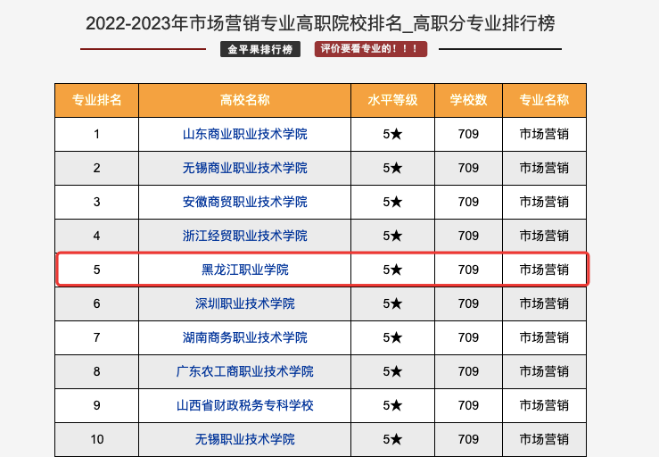 在2022年3月,金平果连续第十一次推出中国高职院校竞争力排行榜,本次高职评价范围以教育部最新公布的《2021年全国高等学校名单》为依据,结合学校的实际招生情况,确定高职院校评价对象为1516所,其中高职高专1484所、职业本科32所。从学校、地区、类型、专业大类、专业类、专业和专业群等多维度科学量化结果。永利集团88304官网市场营销专业在2022-2023年高职院校专业排名中位居全国第五位。
