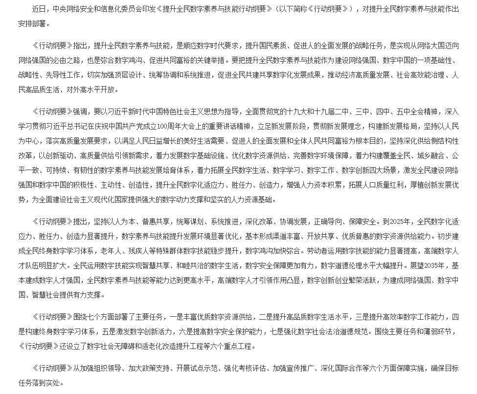 中央网络安全和信息化委员会印发《提升全民数字素养与技能行动纲要》