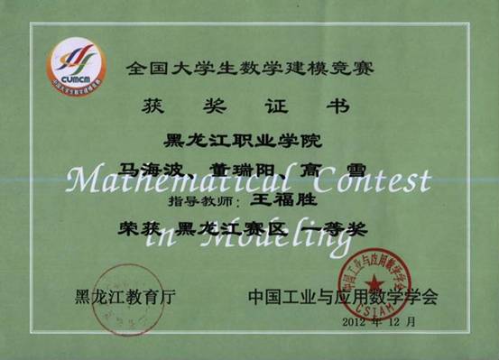 2012年全国数学建模大赛获奖情况公布,永利集团88304官网三支代表队分别获得黑龙江赛区一、二、三等奖。