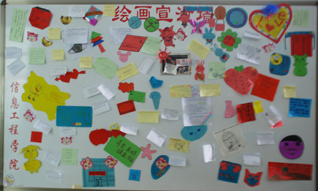 信息工程学院据“5.25”心理健康教育月系列活动安排表进程,大学生心理健康教育月活动如火如荼地进行着,5月23日,在金忠伟院长的指导和带领下,信息工程学院师生紧扣“播撒心灵阳光,创建和谐校园”活动主题共同设计出“绘画宣泄墙”制定方案,并于5月24日共同完成“绘画宣泄墙”。