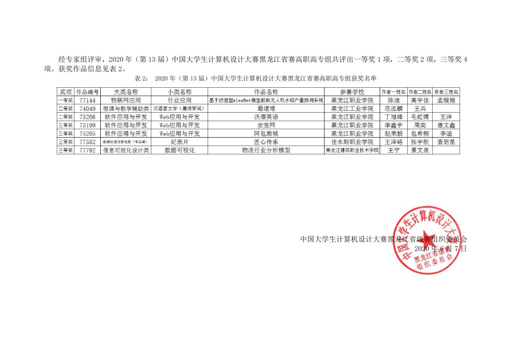 本次竞赛中,信息工程学院唐哲卿、陈天凯老师指导陈迪、高宇佳、孟媛媛同学的参赛作品《基于改进型AlexNet模型航载无人机水稻产量预测系统》获得黑龙江省赛一等奖,张兴华、董欣老师指导丁旭锋、王洋、毛虹博同学的参赛作品《沃德英语》获得省赛二等奖,张兴华、赵正道老师指导李鑫宇、周奕、唐文鑫同学的参赛作品《安宠网》获得省赛三等奖,张兴华、刘红梅老师指导赵荣毅、包希桐、李涵同学的参赛作品《阿包商城》获得省赛三等奖。