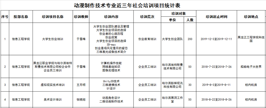 表2动漫制作技术专业教师近三年社会培训项目汇总