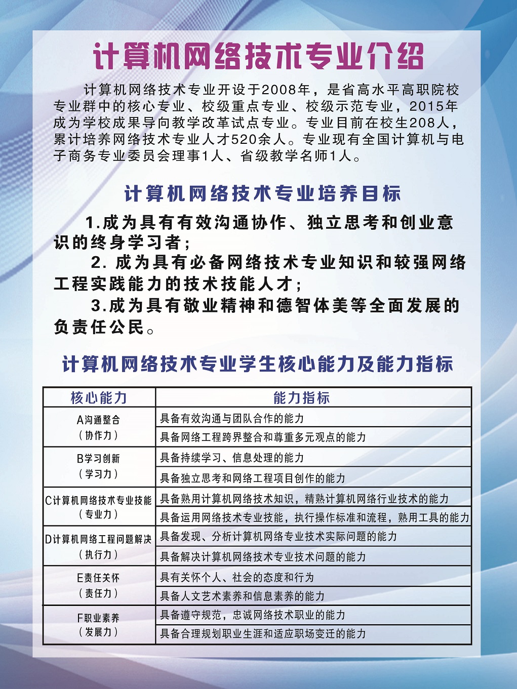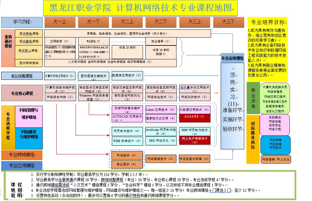 黑龙江职业技术学院计算机网络技术专业开设于2007年,现为校级示范专业、重点专业、悉尼协议认证专业、成果导向教学改革试点专业。在校生347名,累计为省内外培养网络技术人才专业毕业生832名,近三年就业率100%。