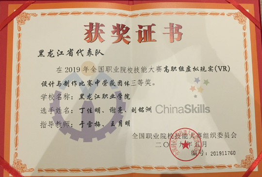 虚拟现实(VR)技术赛项获三等奖奖证书
