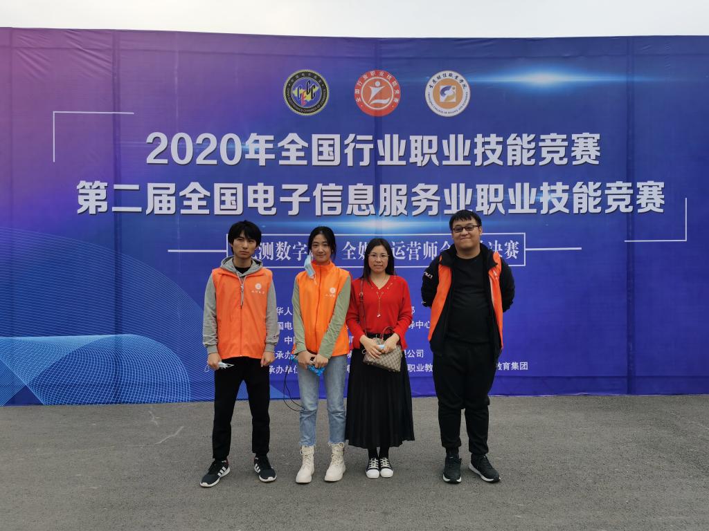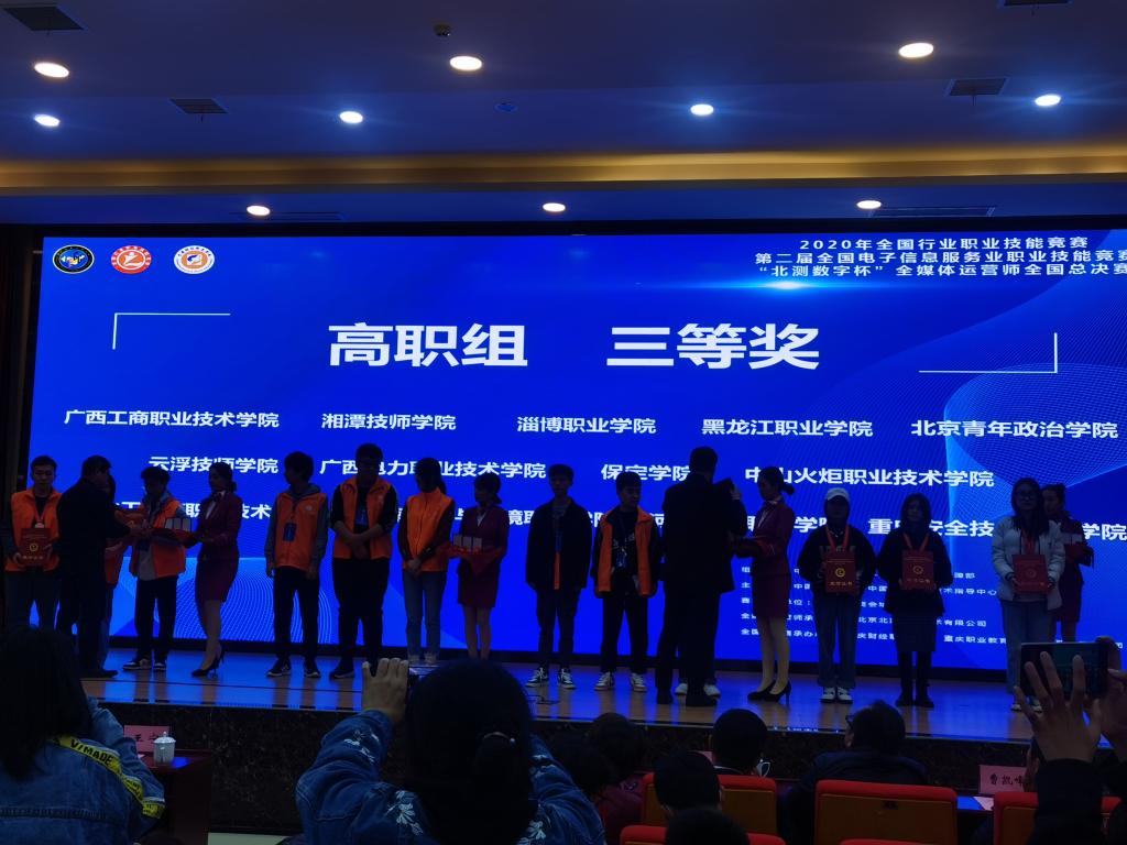 2020年11月21日,在由中国电子商会及中国就业培训技术指导中心主办,由北京北测数字技术有限公司及重庆财经职业学院承办的,“2020年全国行业职业技能竞赛-第二届全国电子信息服务业职业技能竞赛-‘北测数字杯’全媒体运营师职业技能竞赛”全国总决赛中,永利官网信息工程学院派出了由软件技术专业王天琪、刘福龙、张美怡3名选手组成的代表队参加比赛,比赛总成绩为80.8分,荣获全国总决赛三等奖。
