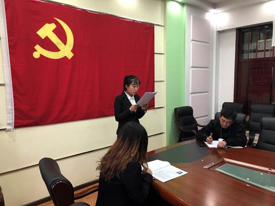 会议开始由辅导员代表赵正操宣读中国共产党章程,在朗朗的诵读声中,大家对《中国共产党章程》的结构和内容,对党的性质、宗旨、指导思想、奋斗目标以及党员的权利和义务,有了更深刻的理解。然后由两名入党积极分子各自宣读入党志愿书,入党介绍人分别介绍了入党积极分子的情况,随后由与会的正式党员进行不记名投票,对两名入党积极分子能否吸收为中共预备党员进行票决。经过不记名投票和票数统计,两名入党积极分子均符合吸收为预备党员的票数。