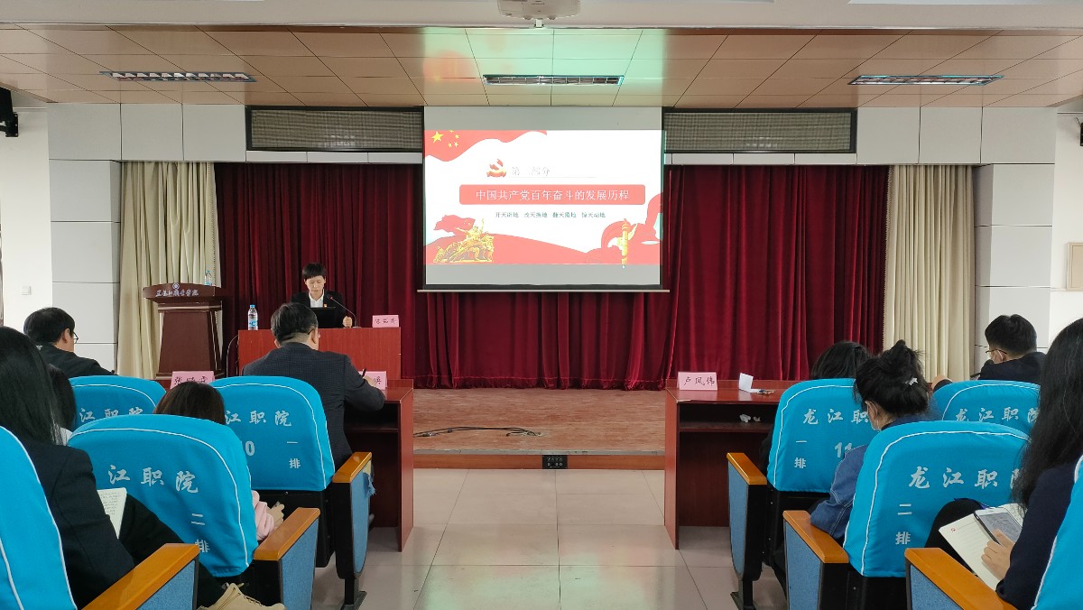 活动首先由双城区委党校陈茹香教授进行党史专题讲座,内容分三个部分,党史教育对大学生理想信念教育的重大意义、中国共产党百年奋斗的发展历程、中国共产党百年奋斗的经验启示,高度概括了中国共产党波澜壮阔的百年历史,总结并带领同学们朗读了中国共产党百年奋斗的经验启示,使我们更加了解党的光辉历程,加深了对党的崇敬和热爱。