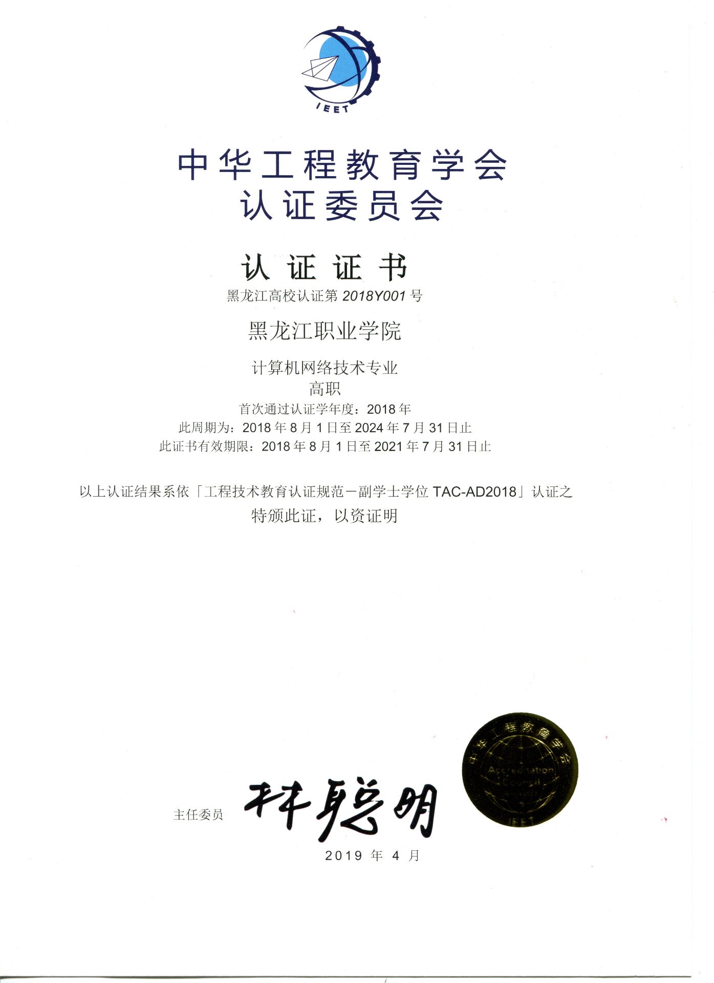 2019年4月19日,IEET工程及科技教育认证证书颁发典礼暨黑龙江省高职院校工程教育认证研讨会在西安举行,中华工程教育学会在西安IEET工程认证研习会上对去年参与并通过工程教育技术教育(TAC-AD)认证的黑龙江高职院校校专业进行证书颁发,各位获认证的专业代表们出席了本次会议。