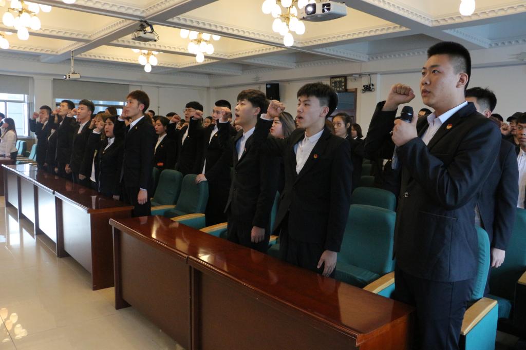 会上,全体学生干部起立,奏唱团歌。会上,杜超宣读了《关于拟推荐朱鑫浩、陈宇航、郭思雨为2019-2020学年校团委兼职学生副书记的决定》;唐晓恬宣读了《关于校团委老师分工分管的决定》;陈佳男宣读了《关于拟任命2018级校学生会、校社团联合会、校新媒中心主要学生干部的决定》;王婷婷宣读了《关于拟任命2018级校社团联合会各社团社长的决定》;朱鑫浩宣读了《关于聘任邹良潇等6名2017级学生干部为2018级校级学生会、校社联、校新媒顾问指导的决定》,邹春雷为邹良潇等6名同学颁发了聘书;陈宇航宣读了《关于2018级校学生会、校社联、校新媒主席团分工分管的决定》;郭思雨宣读了《2018级校学生会、校社联、校新媒主要学生干部“自律15条”》。会上,2017级各学生组织主席和2018级各学生组织主席进行了会旗交接,并进行了学生组织的口号展示,2018级校学生会主席张昊睿同学带领全体学生干部进行了入职宣誓。