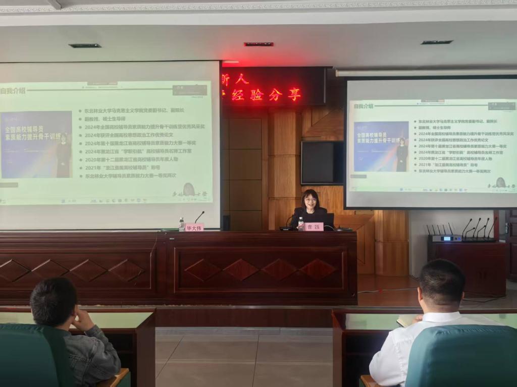 5 月 15 日上午,东北林业大学马克思主义学院党委副书记、副院长曹颖教授,为永利官网辅导员带来题为《以赛促学强本领,以行践知育新人 —— 全国高校辅导员素质能力提升训练营经验分享》的讲座。学生工作部部长毕大伟、学生工作部党总支书记石倩、各二级学院党总支副书记、学管办主任,及全体辅导员、公寓辅导员参加此次培训。