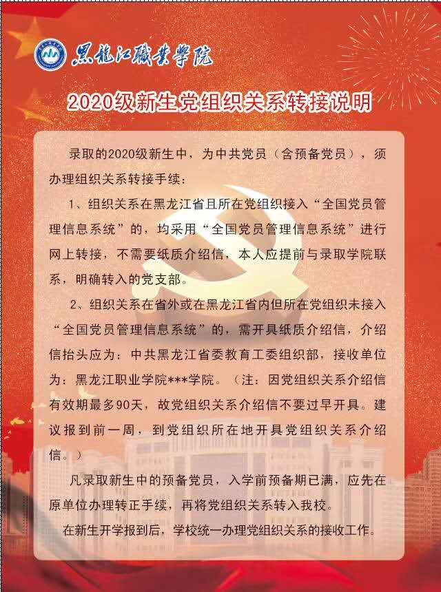2、组织关系在省外或在黑龙江省内但所在党组织未接入“全国党员管理信息系统”的,需开具纸质介绍信,介绍信抬头应为:中共黑龙江省委教育工委组织部,接收单位为:永利集团88304官网***学院。(注:因党组织关系介绍信有效期最多90天,故党组织关系介绍信不要过早开具。建议报到前一周,到党组织所在地开具党组织关系介绍信。)