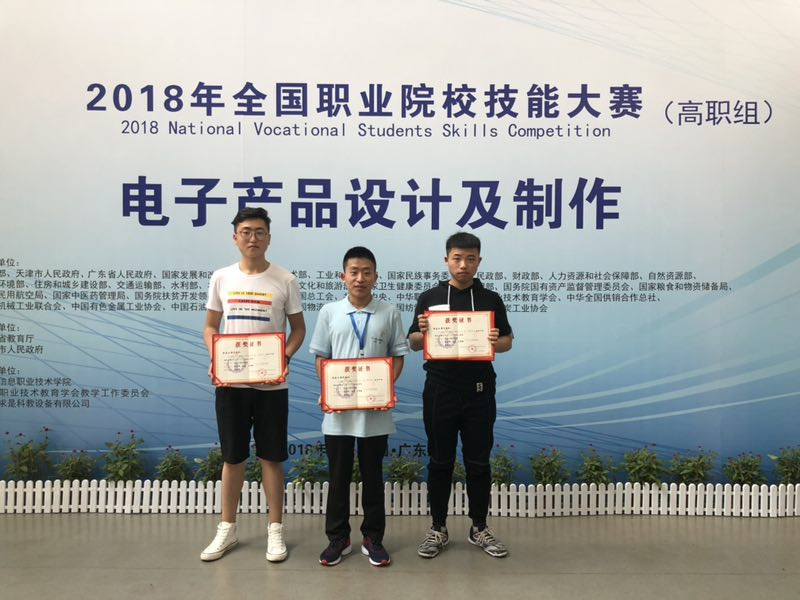 5月22——24日,在 2018年全国职业院校学生技能大赛国赛(高职组)“电子产品设计及制作”赛项中,永利官网电气工程学院电气自动化技术专业学生王麒懿、应用电子技术专业学生陈占坤、孙岩在指导老师黄雨鑫和徐鹏指导下,沉着应对,稳定发挥,从69支参赛队中突出重围,最终获得国赛三等奖的好成绩,完成本赛项历史性突破。
