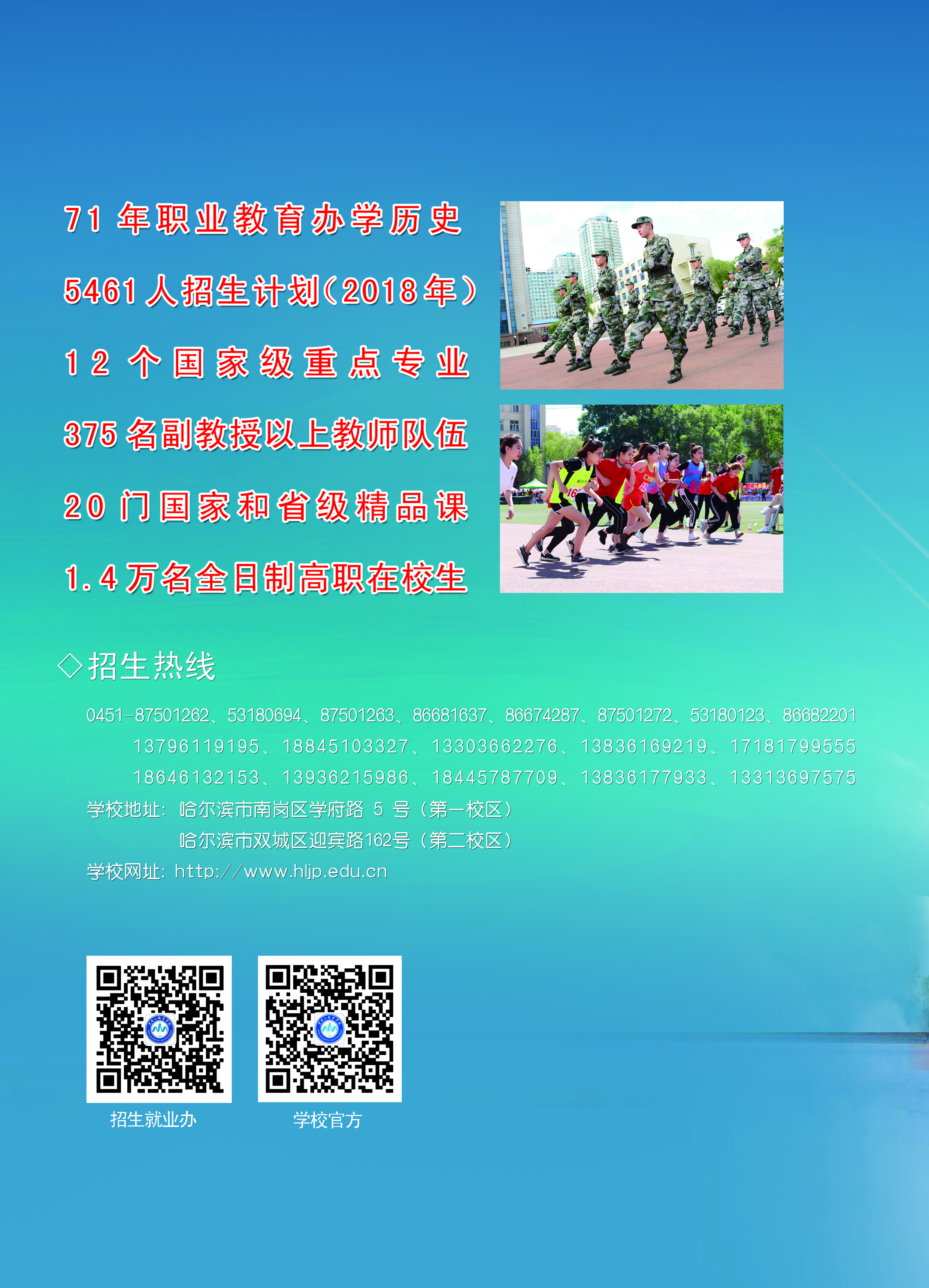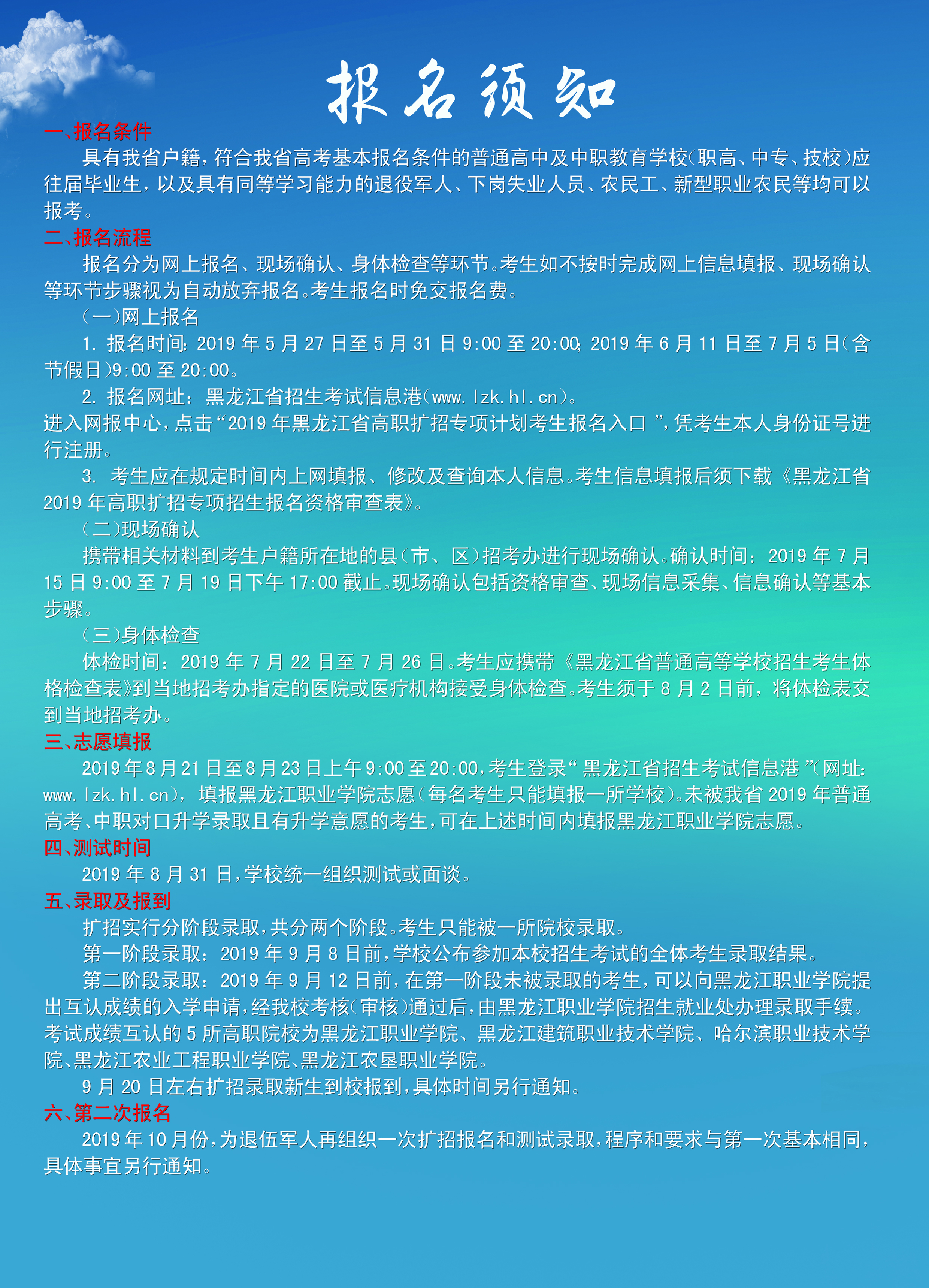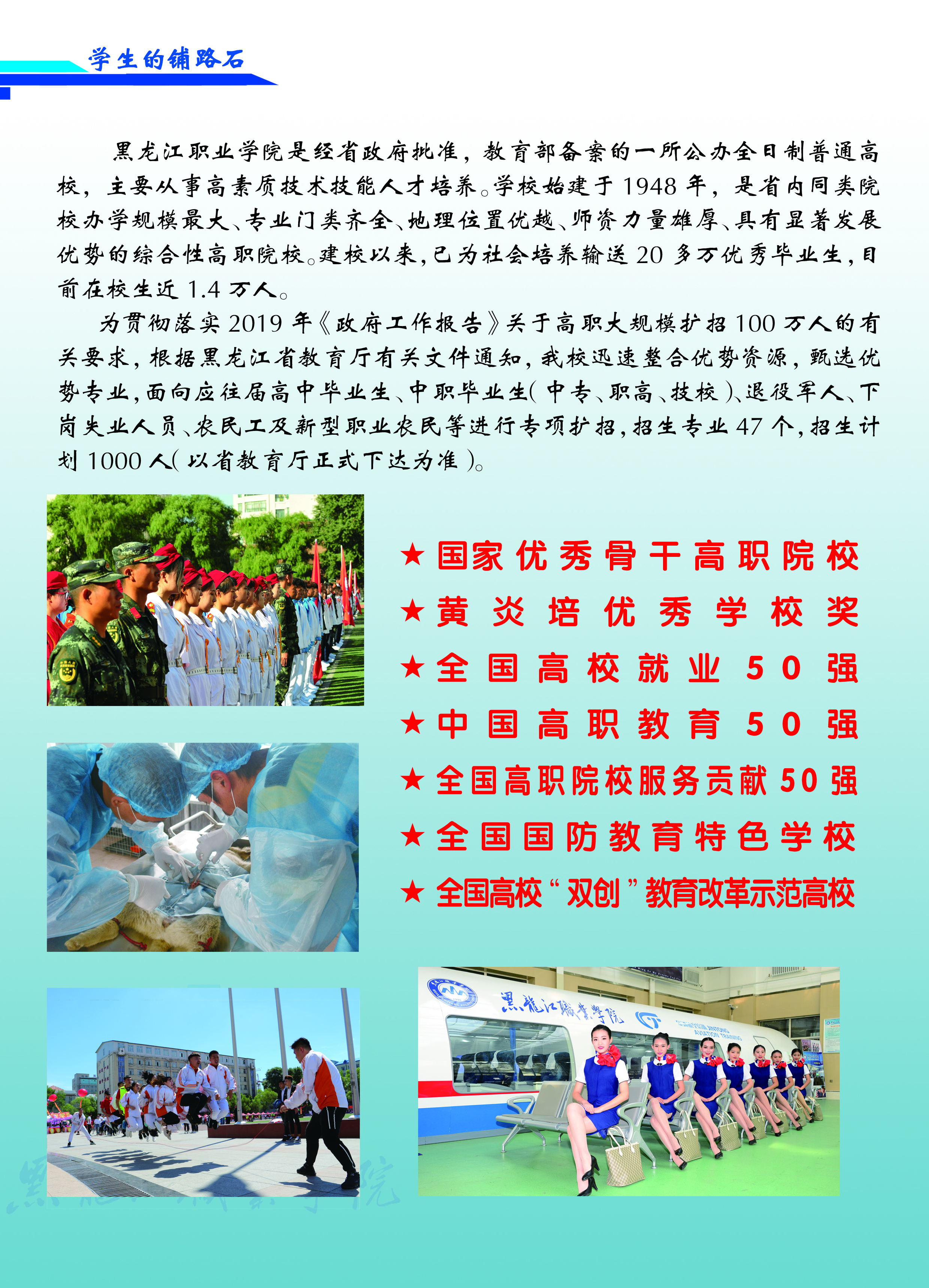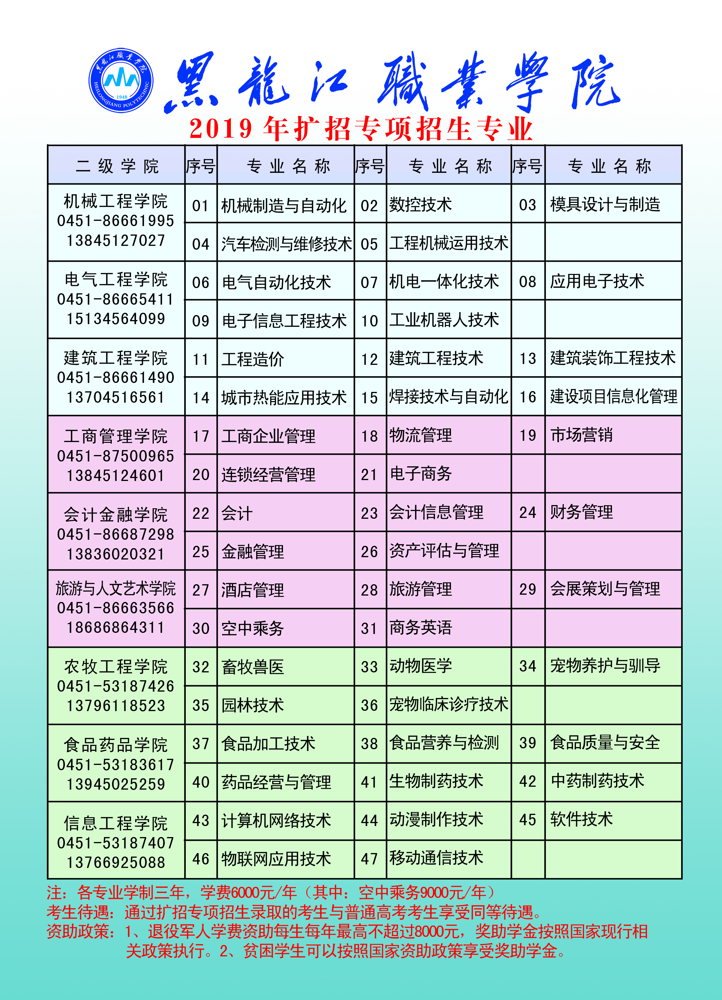 为贯彻落实李克强总理在2019年《政府工作报告》中提出的“高职院校扩招100万”讲话精神,根据省教育厅有关文件要求,永利官网迅速整合优势资源,甄选优势专业,现对应往届高中毕业生、中职毕业生、退役军人、下岗工人和农民工等人员展开专项扩招。招生专业47个,招生计划1000人。