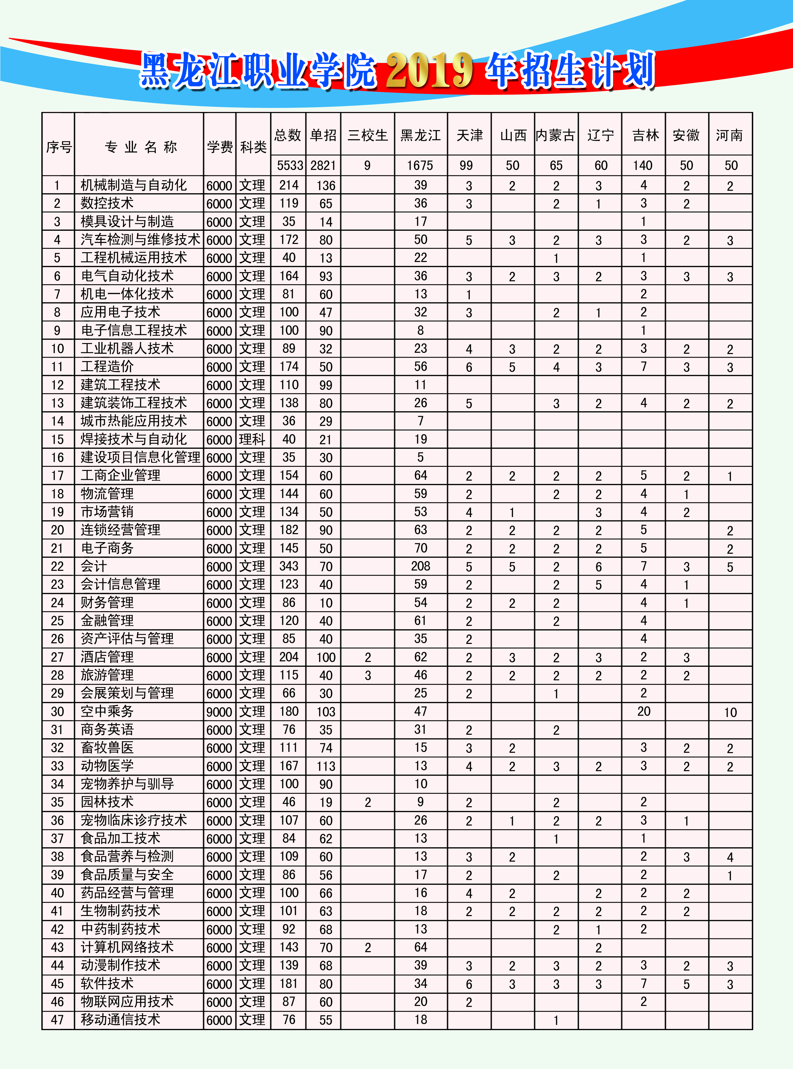 永利集团88304官网2019届分省分专业招生计划